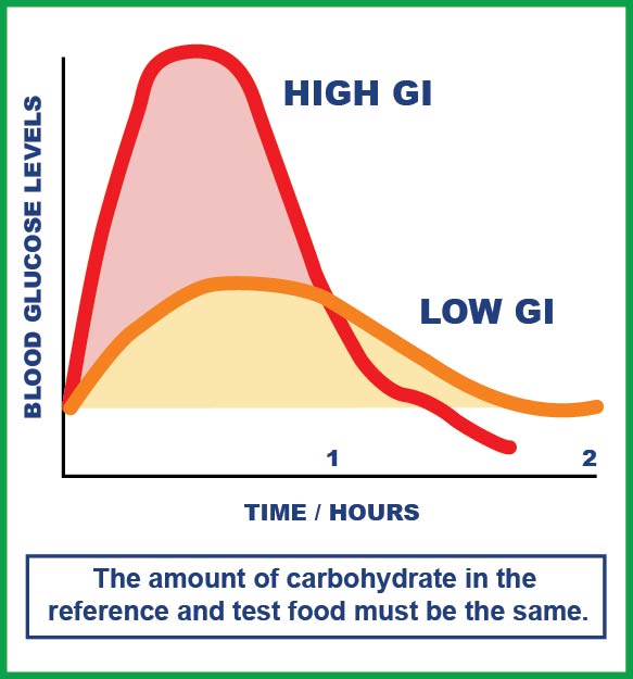 Carbohydrate is an essential part of our diets, but not all carbohydrate foods are equal. The Glycemic Index (GI) is a relative ranking of carbohydrate in foods according to how they affect blood glucose levels. Carbohydrates with a low GI value (55 or less) are more slowly digested, absorbed and metabolised and cause a lower and slower rise in blood glucose and, therefore usually, insulin levels.